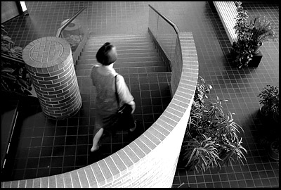 - Tanya walks down the steps of our midwife's office building after